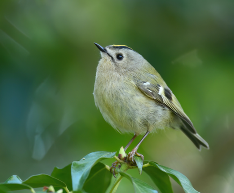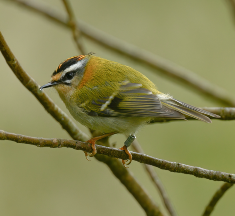 For the past two years, I've also been keeping an eye on a pair of Firecrests. What has been fascinating is that, although Firecrests usually migrate to warmer regions for the winter and return in the spring to breed, this pair has remained on their territory throughout the colder months. Recent winters have been relatively mild, and their chosen territory offers good shelter from the weather. The trees nearby are covered in ivy which seems to provide the insects they need to survive. So let me introduce you to Fergus, the feisty Firecrest. He was first caught by a bird ringer two years ago and the small ring on his right leg has made him much easier to identify ever since. Firecrests are tiny, fast-moving birds that flit restlessly through the branches, and spotting them can be a real challenge. This spring I had the chance to watch Fergus in the thick of territorial battles with the male Goldcrests whose territories bordered his on either side. These skirmishes were dramatic affairs - birds launching themselves at one another, tumbling out of the trees in a furious tangle, only to break apart at the last moment before hitting the ground. There was also plenty of wing-flapping, moving together in quick, jerky movements and loud, scolding calls. For such small birds, their voices reach an impressive volume.